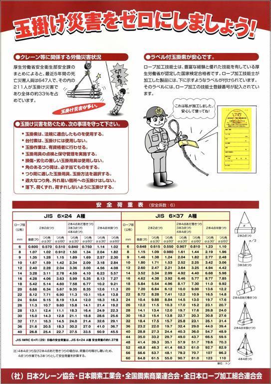 この「玉掛け災害をゼロにしましょう!」は、(社)日本クレーン協会・日本鋼索工業会・全国鋼索商業連合会・全日本ロープ加工組合連合会のワイヤロープ(ワイヤーロープ)関連4団体が共同で発行している、玉掛け災害を無くすための安全啓発用ポスターです。