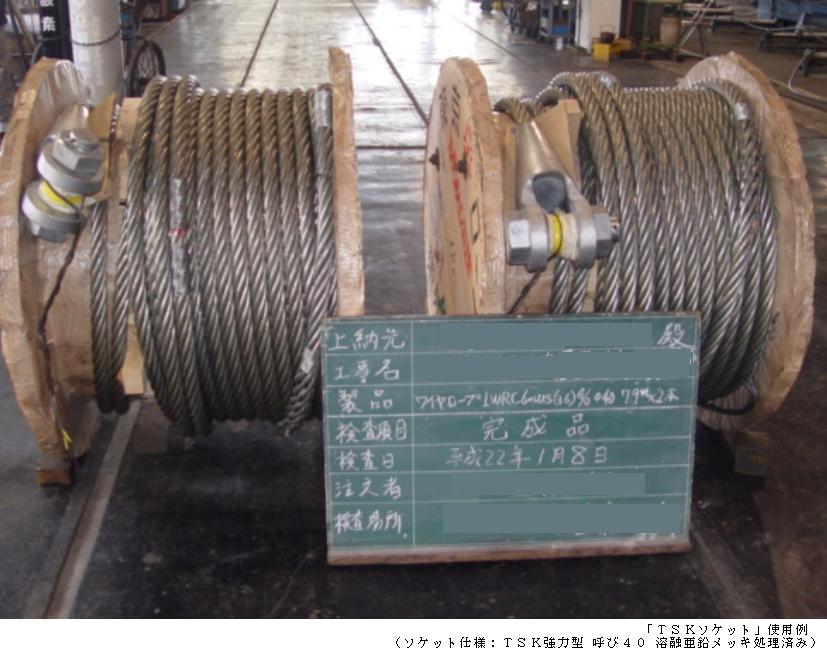 ワイヤロープ(ワイヤーロープ)の端末加工には種々の方法がありますが、重要な用途あるいは長期使用箇所では最も確実な方法としてソケット止め加工(締結効率100%)があります。