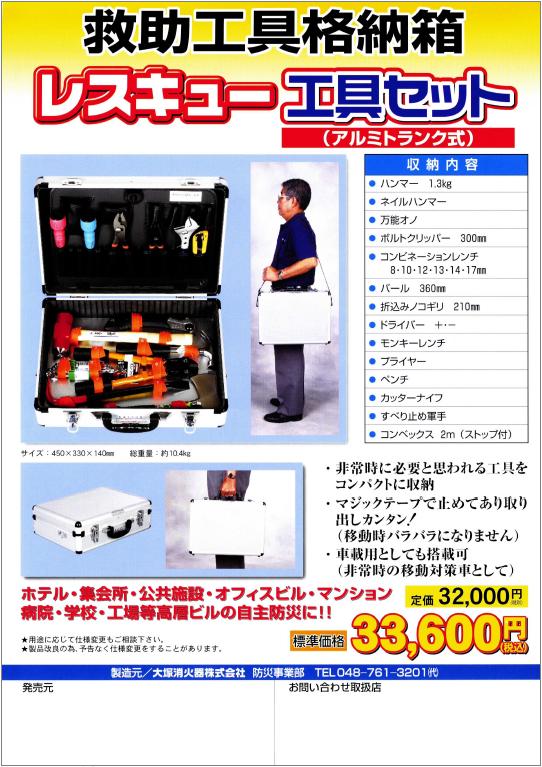 大塚消火器の『レスキュー工具セット』(レスキュウ工具セット)は、非常時に必要と思われる工具類をアタッシュケース形収納箱にコンパクトにまとめた救助工具一式セットです。