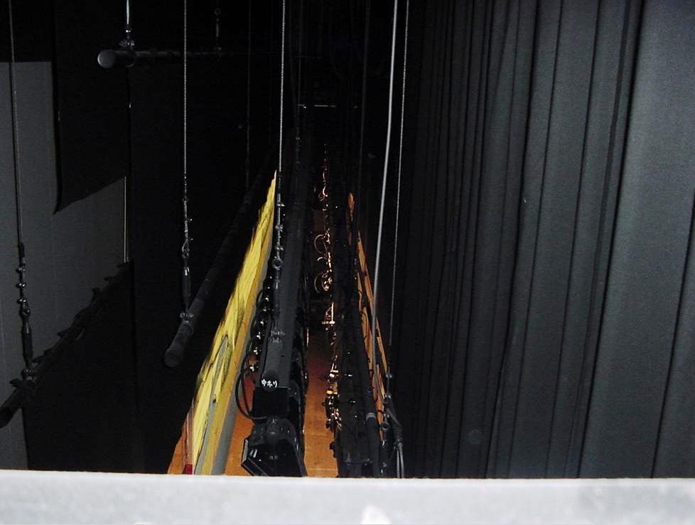 写真では少し判りづらいですが、たくさんのロープが使われているのが見ていただけるかと思います。これは大阪市内のある有名な劇場の舞台装置を撮影したものですが、普段あまりご覧になって頂けない舞台裏の世界で、照明機器や音響板、幕といった舞台装置を動かす部品として弊社のワイヤロープが活躍しています。決して目立たない地味な存在ではありますが、逆に目立たない事が重要で、その意味ではとてもワイヤロープらしい使われ方かもしれません。