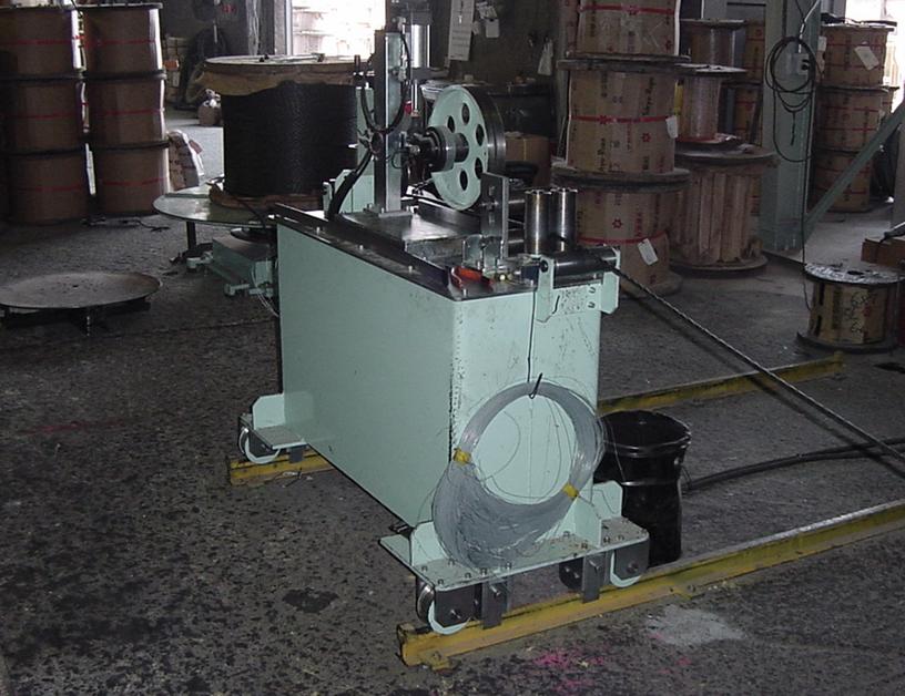 ワイヤロープ(ワイヤーロープ)は、ロープという性質上長さの管理が非常に重要になります。特に長尺のものでは、短すぎるのはもちろんですが長すぎても不都合があります。そこで平成13年に弊社用に特別に設計・製作した、ターンテーブル/検尺機/巻取機/操作表示盤の各部からなるコンピュータ制御式の自動検尺巻取・記録装置を新たに導入しました。